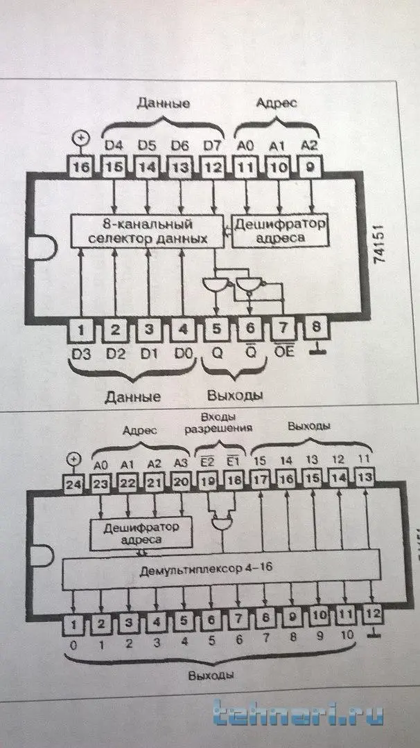 на верхней выбранный адресом бит входной шины данных передается на выход, а на нижней кодом адресной шины выбирается соответствующий выход
