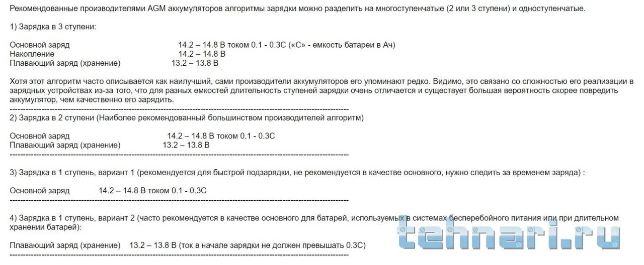 Наиболее рекомендованный большинством производителей AGM аккумуляторов алгоритм зарядки током 0.1 - 0.3С («С» - емкость батареи в Ач,т.е 0.3 х 7 = 2.1 А,сила тока от 10 до 30% от емкости батареи.)