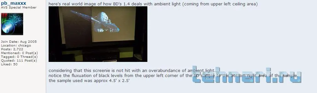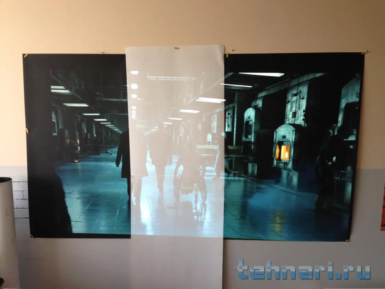 Во вторых даже промышленный экран(DNP)имеет сравнительно не большой угол обзора(+20-20 от оси проектора)именно этим обусловлено столь высокое усиление ,я ранее уже писал но повторю что боковое освещение не влияет на цвет полотна и значит на уровень черного,по этому картинка измениться и в полной темноте и при свете в комнате(исключаются любые источники света со стороны проектора! ! !) Обратите внимание на то как засвечен светом из окна основной экран и посмотрите на ткань(засветки нет) это фото без проекции и именно так должен выглядеть экран при правильной установке(не должно быть окна на против экрана!!!)свет только сбоку...