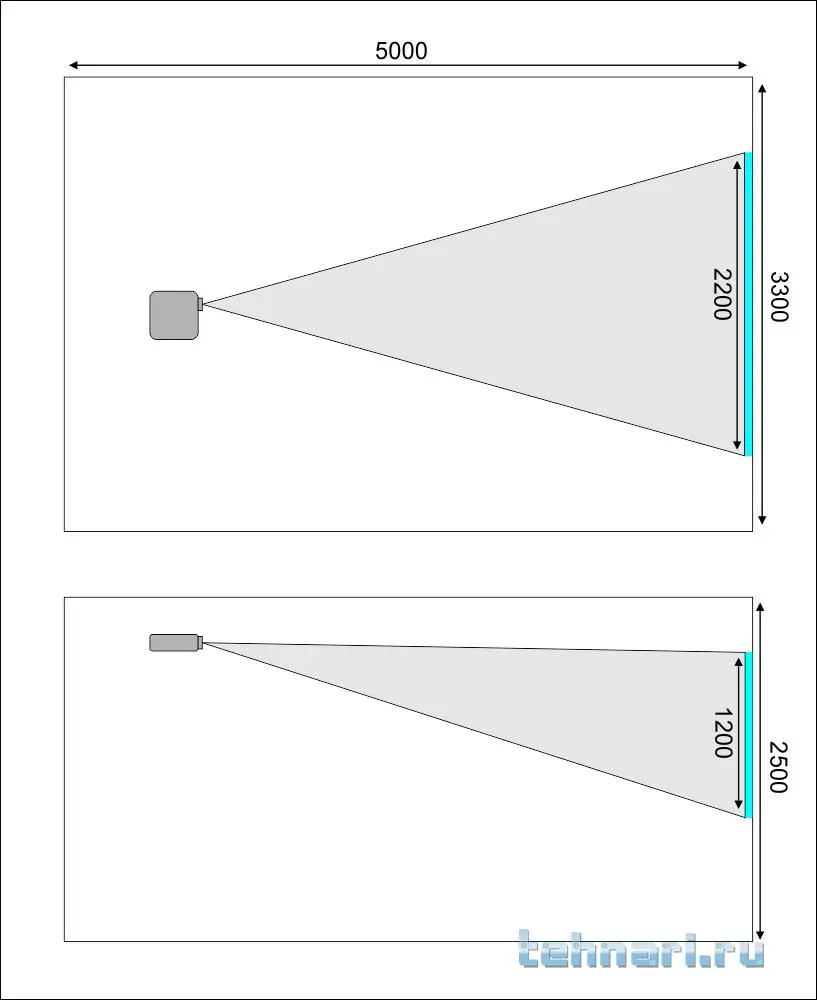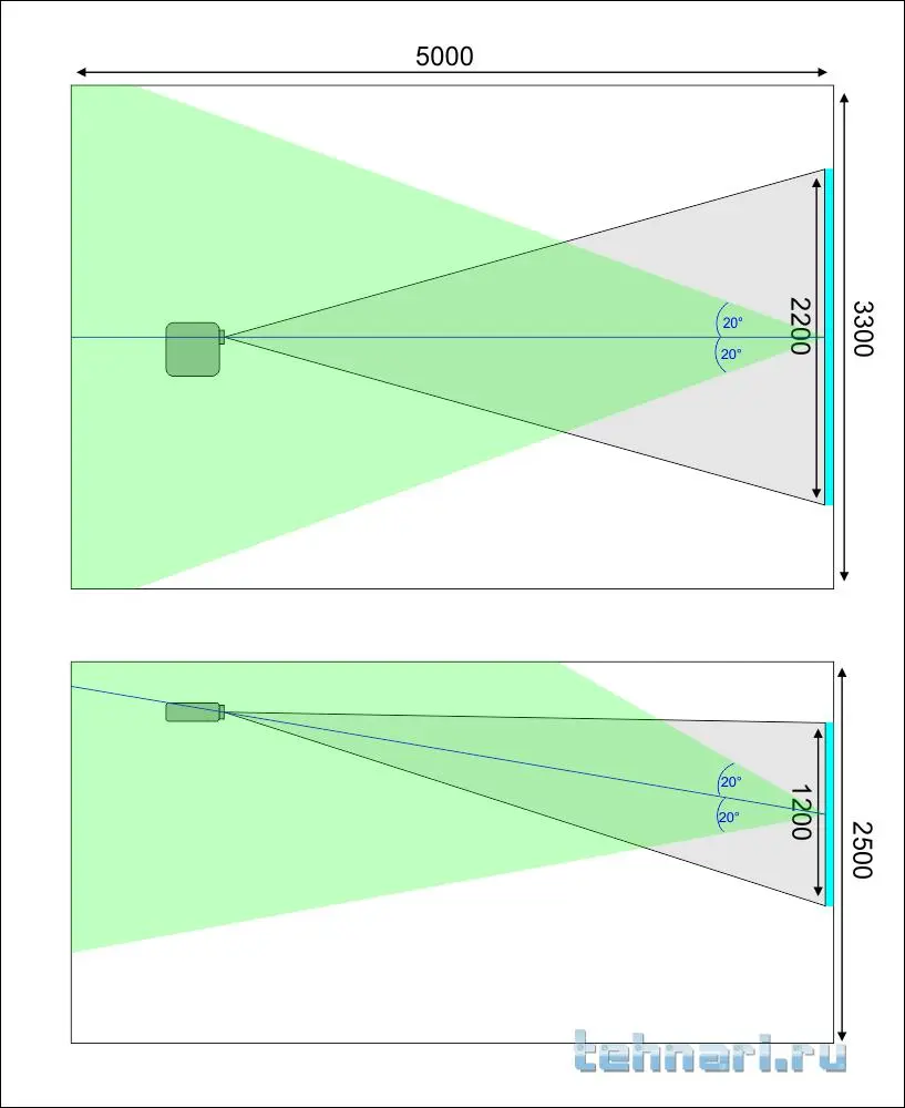 На нижнем рисунке от центра экрана проведите конус с осью проектор-экран с углом раскрыва +-20гр,достаточно снизу.А по горизонтали высоту глаз ,напр ,на уровне 1,2м от пола. И все сами увидите.Возле задней стены лучше будет,тк расширяющаячя зона конуса будет ниже,чем у экрана.И если экран дальше от зрителя,то ниже нижняя часть конуса.