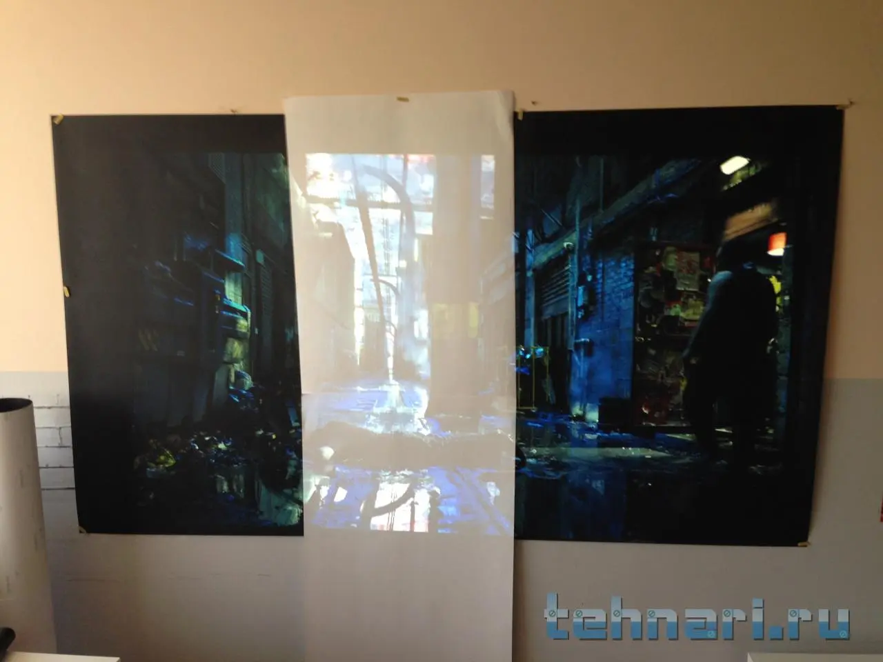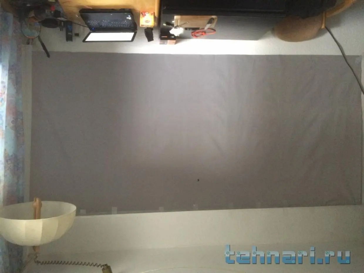 Повесил я очень просто на обычный скотч на стенку только сверху полностью по всей длине горизонтально и каждые 30 см горизонтально укрепил.Все гуд держится и нету никаких волн. Полотно метр от пола, а проектор полтора метра. Расстояние около 3 метров