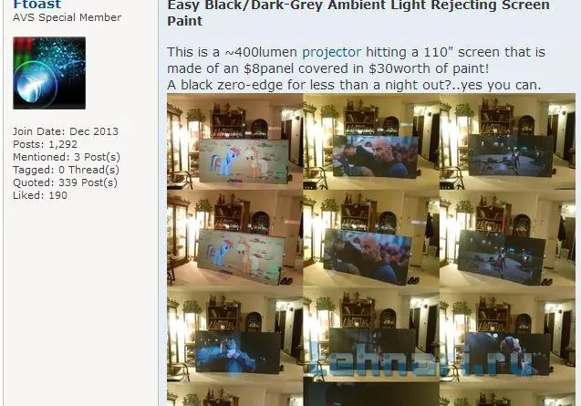 Да и еще экран под проекцией будет выглядеть по иному(темнее) и по этому не стремитесь сделать его черным иначе угробите только яркость а контраста Вам хватит и так с избытком..(Красил все кистью так как пока не освоил краскопульт но качество зависит и от способа нанесения ) Когда освою краскопульт- это будет совсем другая история...
