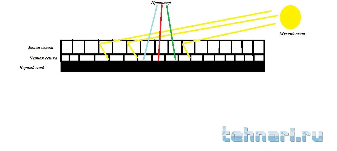Но уверен если раздвинуть слои (темной и белой тканей) эффект с хитрым черным слоем может сработать..То есть белый слой должен быть мелкой сеткой..Но черный слой будет виден только если сидеть на против экрана,под углом белая сетка сольется и экран будет казаться просто белым..Но и свет не попадет между ячейками под углом так можно получить более глубокий черный при не большом боковом освещении..Если слои находятся в плотную друг к другу они почти одинаково будут засвечены..