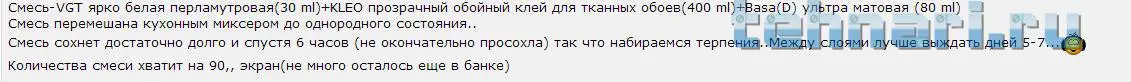 Вообще(больше чем уверен) что сейчас экран с нанесенным одним слоем смеси показывает картинку если не равную по яркости с белым (может чуть меньше)но по ощущению где то рядом..Поясню..Если настройки проектора будут 50 яркость 50 контраст(и смотреть на белом экране) то при настройках 80 яркость 100 контраст(на покрытой слоем плащевке) картинка более выигрышной будет на плащевке(есть хороший уровень чёрного и яркость приличная) На белом экране яркость будет допустим чуть выше но полное отсутствие чёрного..Чёрный экран не только в условиях освещения может работать но контраст картинки намного превосходит белый экран...Я думаю причина в настройках проектора под чёрный экран(они другие) и если я прикладывают белый лист то белый не просто ярче(он искажен излишним уровнем яркости).