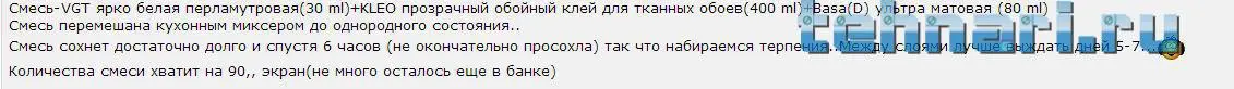 Далее лицевую сторону экрана(плащевка серая) наносите слой(слои) отражающей смеси..Компоненты думаю без проблем купите в Москве..Состав смеси густой как кисель(подумайте чем наносить на такую площадь экрана) я наносил валиком раскатывая пока слой перестает быть светло белым и становиться прозрачным..Потом сушите не менее суток(лучше 3-4) И можете наносить следующий слой..Так же подумайте о креплении к стене Вашего экрана..(натягивать или на раму из дерева)