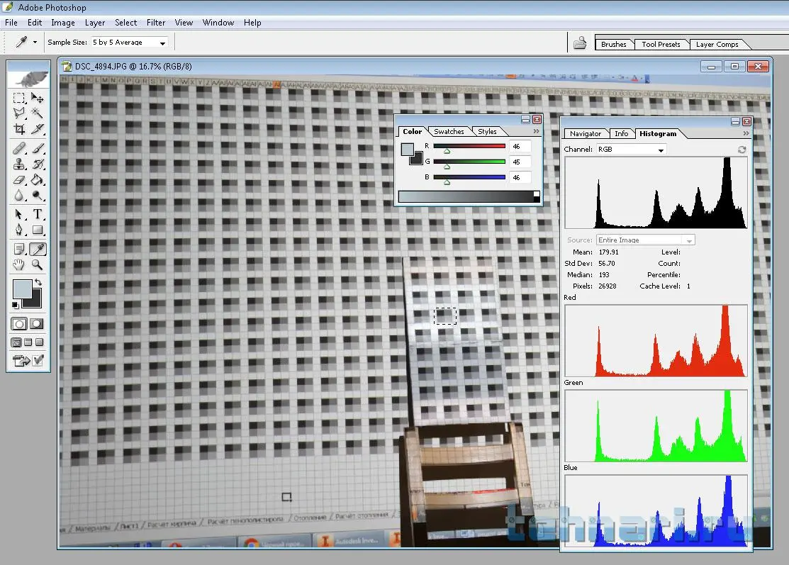В экселе сделал специальные патерны (квадратики черного , серого и белого цветов). Фотографирую на этом фоне образцы покрытий, а по в фотошопе исследую яркости этих самых квадратиков. Из чего можно судить и о яркости и о контрастности.