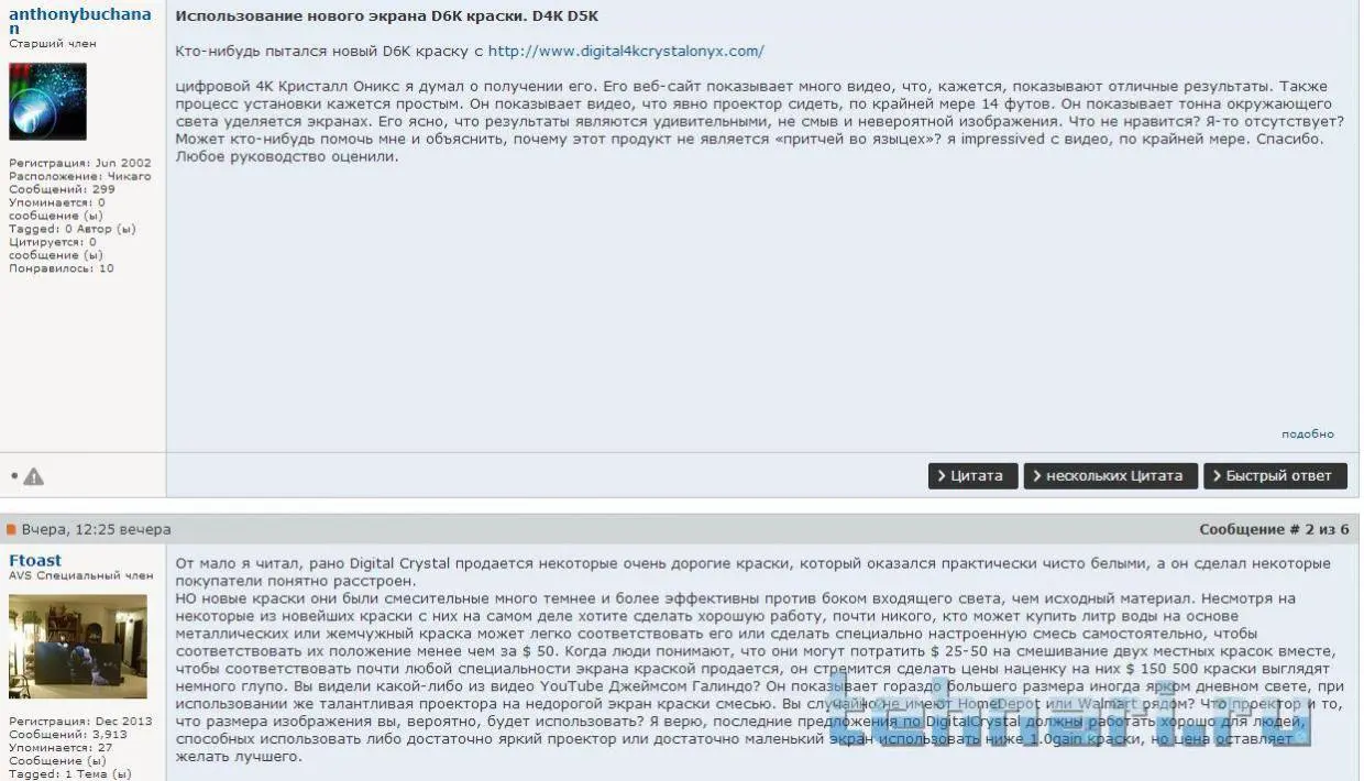 HCORE Это я понял!!!! но будет ли чёрный хороший??? Плюс я говорил что у меня 2 проектора!!! Тот что ДЛП я использую на даче и ребенок часто смотреть пытается при свете! Поэтому мне так же интересен вариант который работает при слабой освещённости!!!DECIDE при всем уважении,у Вас сейчас каша в голове от переизбытка информации..Что бы сделать экран для просмотра в тёмном помещении я же написал -смешайте серую краску тикурилла н499 с краской vgt белая перламутровая в соотношении 50 на 50% ..Этой смесью покройте основу(желательно предварительно нанести слой грунтовки на материал из чего будет экран) Лучше что бы экран был стационарный(жёсткий)..Основа под покраску жесткий лист (сотовый поликарбонат это более доступный материал,красте его.Если в домашних условиях будете красить то лучше краскапультом,если не его то красьте валиком с мелким ворсом,лист кладете на пол и в горизонтальном положении красите..Смесь за один слой плохо укроет (думаю пару слоёв перекроют полностью..)Но этот экран для не сильного подъёма чёрного..Но думаю этого Вам хватит..Попробуйте сделать выкраску на пробном куске,и если понравиться то приступайте к изготовлению большого экрана..Удачи!!