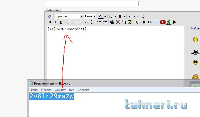 Maracooya на ютубе копируйте то что после равно .. Потом пишите сообщение,расширенный режим(кнопка снизу) и выбираем красный значек(картинка как у плеера) Появиться строчка и вставте скопированные символы..И кнопка ответить(сохранить изменения)