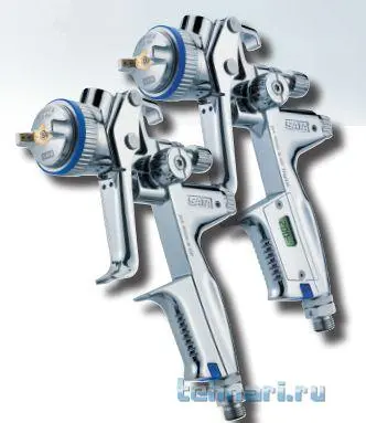 Можно смотреть в сторону пистолетов расчитаных на малое давление! Рабочее давление у них 2,5 атм, а не 4, как у большинства! И сопло меньше по диаметру у первых.