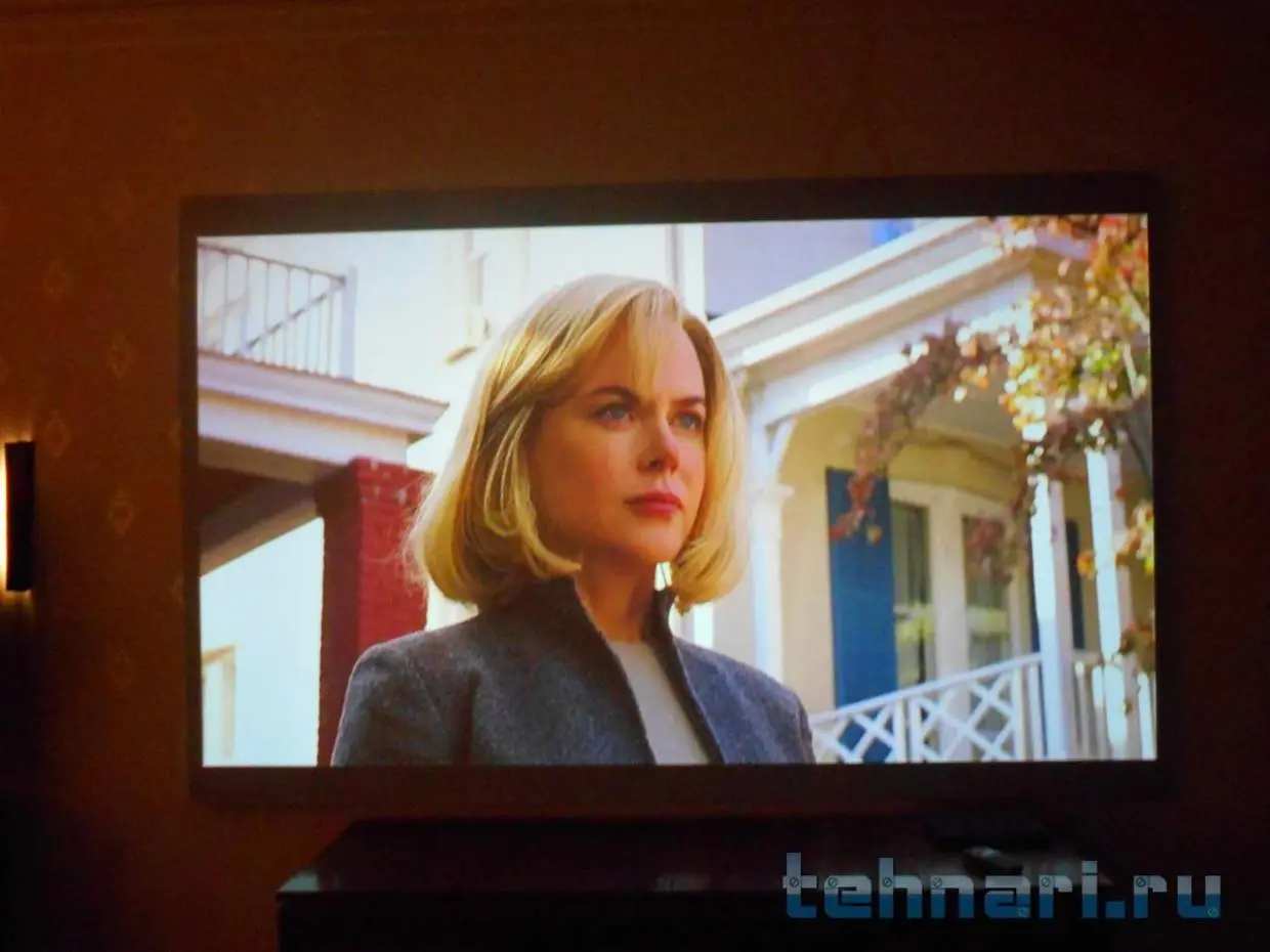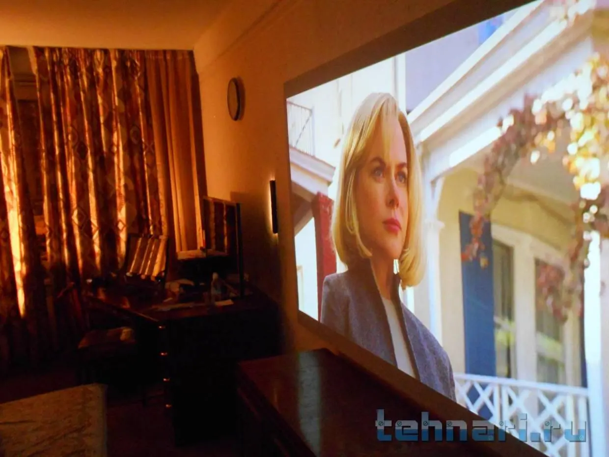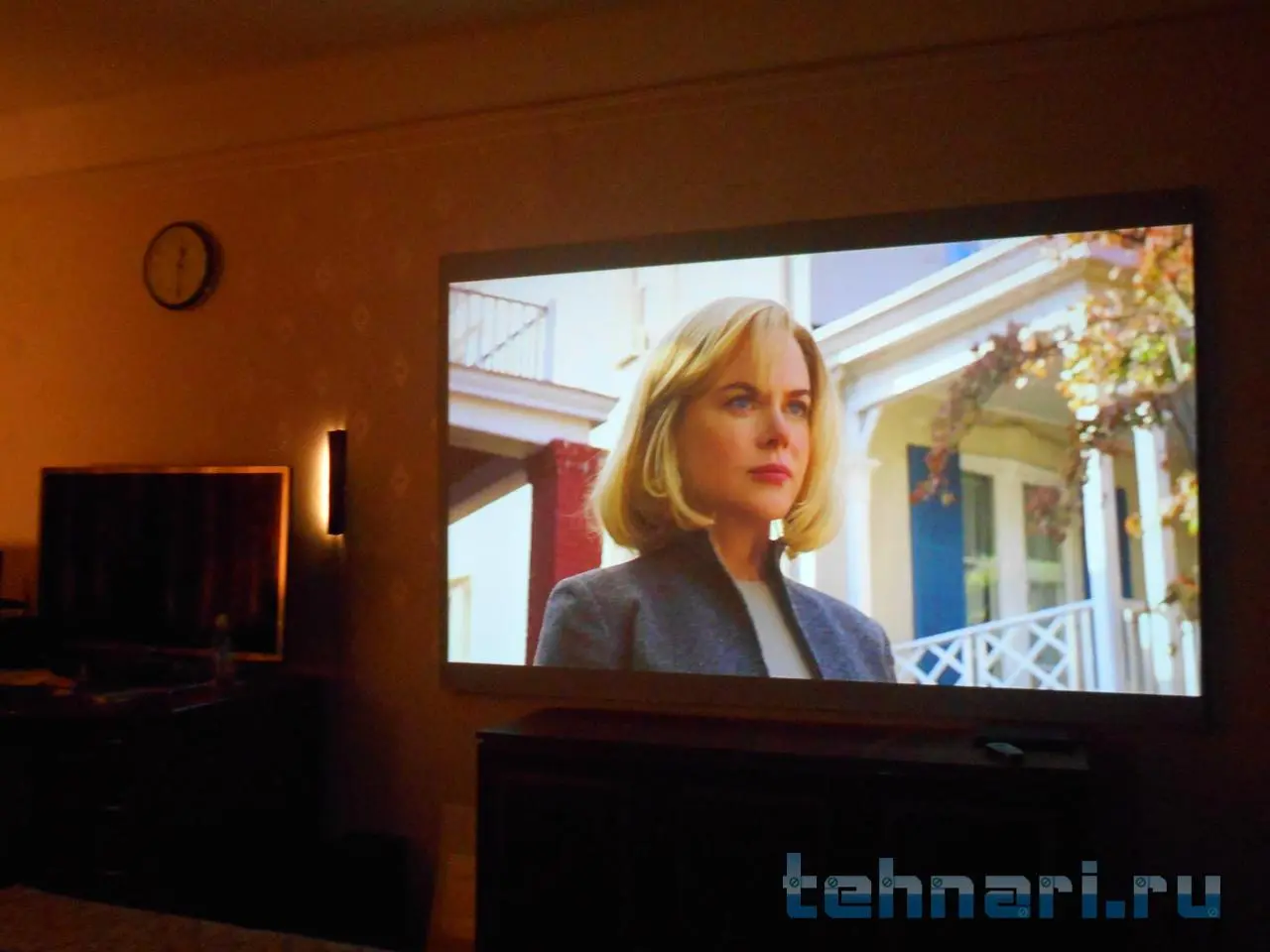 Экран конечно временный из лайкры, тянется прилично. Смотреть достойно можно только в сумерках, идет засвет. :-(
