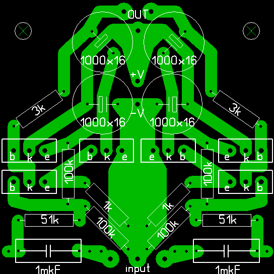 Это простенький усилитель для наушников в классе А, ток покоя 20мА на канал, питание от "кроны".