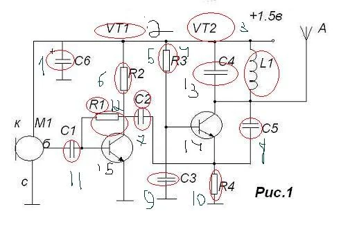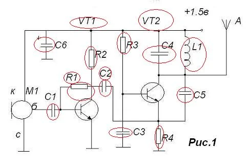 В кругу обозначены изображения радиоэлементов, резисторов, конденсаторов, катушек индуктивности, транзисторов...