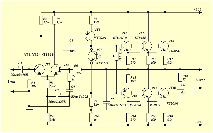 Настройка усилителя сводится к установке тока покоя транзистора VT9 при отключенной нагрузке. В разрыв коллекторного провода включается миллиамперметр и подстройкой резистора R11 устанавливается ток 50-70 мА. Затем проверяется отсутствие постоянного напряжения на выходе усилителя с точностью 0,1В.