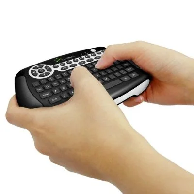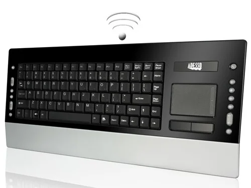 Производители компьютерной периферии Adesso, представили менее компактного собрата, под маркировкой WKB-4200UB (крайний справа) с беспроводным контроллером, работающим на частоте 2,4 ГГц. Это полноразмерная QWERTY-клавиатура, совмещенная с ноутбучным тачпадом, полосой прокрутки и левой/правой клавишами мыши. На ней есть и дополнительные выделенные клавиши для интернета, шесть мультимедийных клавиш и три кнопки управления ПК. Работает беспроводная клавиатура на расстоянии до 9 метров. В одной комнате можно использовать несколько таких клавиатур, они различают до 12 каналов идентификации. Для экономии батарей AAA применяется спящий режим и отключение питания после 10 минут неиспользования устройства.