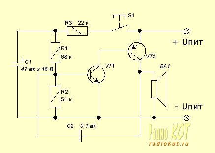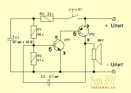 Cхема отлично работает сам собирал год назад хотел сделать сирену на сигнализацию....Я еще собрал простой симетричный мультивибратор и подключил его один выход в место кнопки SA1 сирены.и работает до сих пор