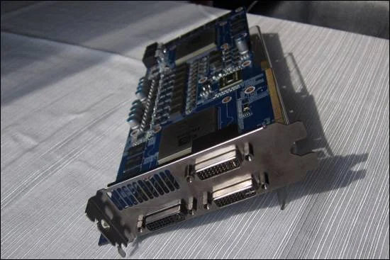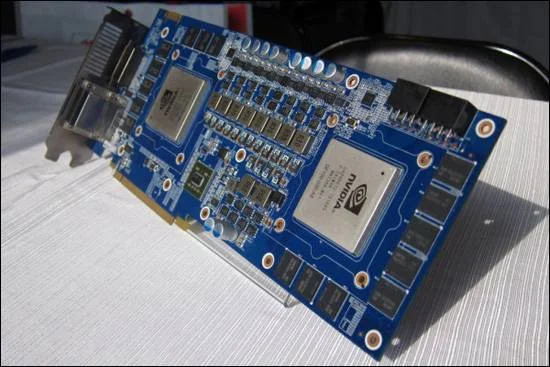 Эта диковинка изготовлена на оригинальной по дизайну печатной плате синего цвета и наделена дуэтом из чипов GF100. Для организации дополнительного питания предусмотрена пара специальных 8-контактных разъёмов, тогда как набор выведенных на заднюю панель выходов включает наличие только трёх портов DVI.