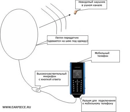 Петля через голову надеваться на шею и под рубашку,штекер подключаеца к плееру с записанными за ранее билетами а сам плеер в карман,отрезанные наушники в уши.