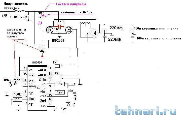 Вот схема, делалась в железе. Стабилитрон для сглаживания импульсов и конденсатор нужны, после того, как раз пять сгорели ключи, то эти элементы поставили (пришли к этому решению не сразу, но нашли причину, правда провода длинные, порядка 10м), и уже работает пару лет без проблем. До 200 ватт нагрузки радиаторы не нужны. А при нагрузке более 400 ватт надо еще и вентилятор для обдува ключей.