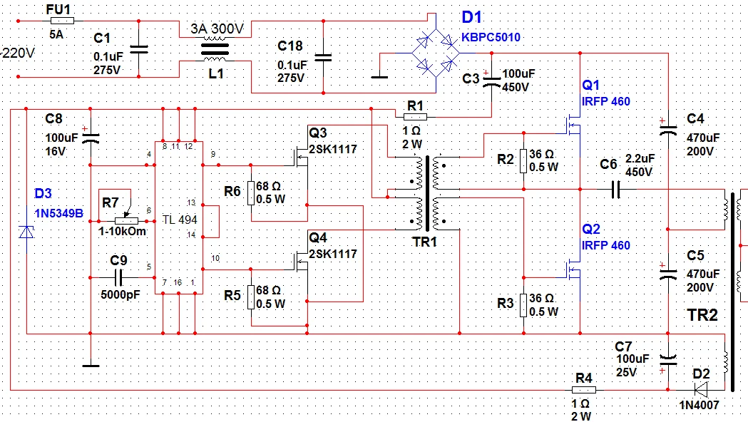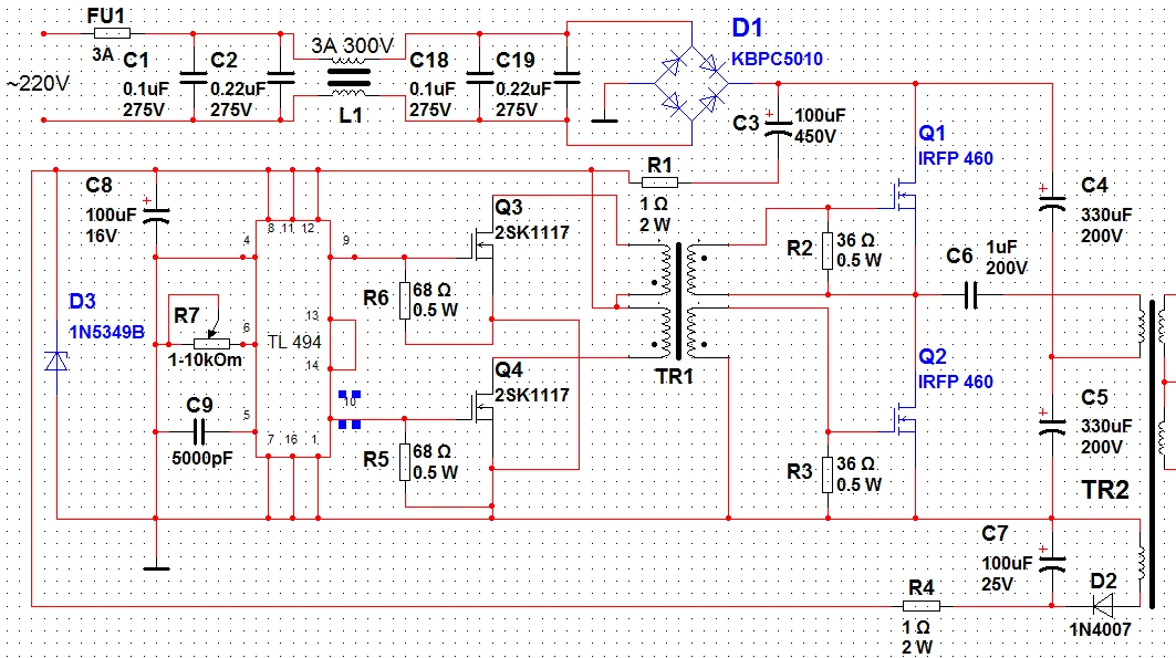 небольшой радиатор. Силовые электролиты С4, С5 должны быть 470uM и конденсатор С6 2.2uM 450V, это для 600Вт и вообще при 30 кГц на двух выходных Фетах выдавить 600Вт мне кажется не реально. На выходе С12 и С13 тоже можно убрать. Послушаем далее groks и Stvol ... :)