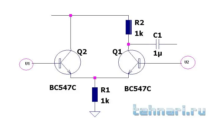 1 эмиттерный повторитель, который усиливает ток, но не усиливает напряжения, обладает большим входным сопротивлением.