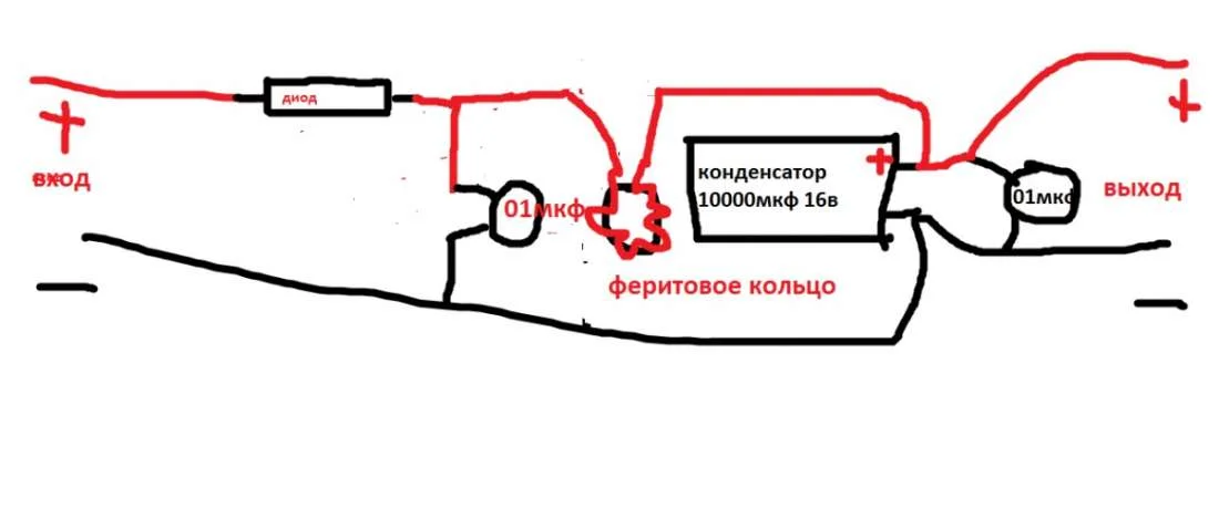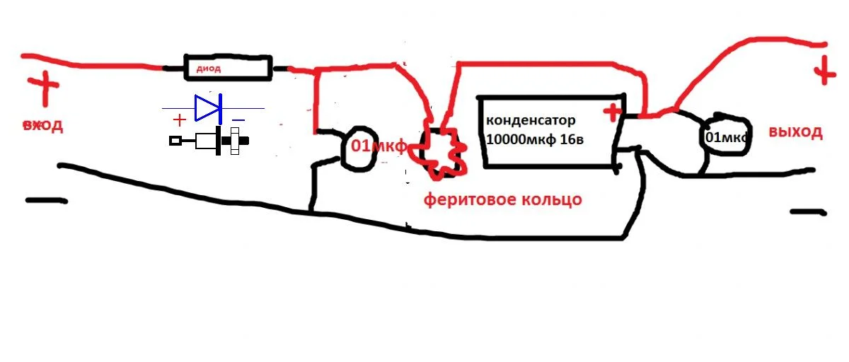 Вот это схема фильтра питания для тда 1558 , источник питания бортовая сеть мотоцикла