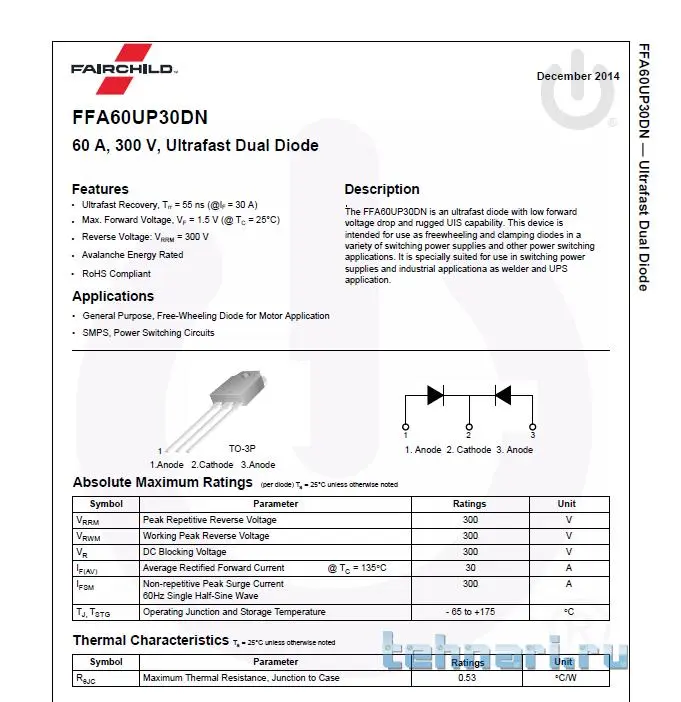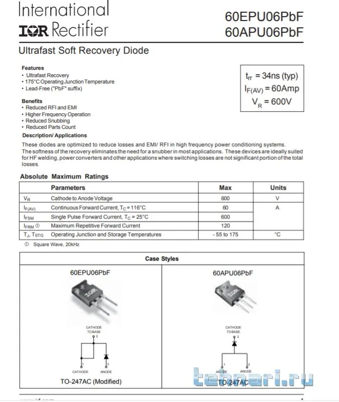 Друзья! помогите найти паспортные данные на диод FFA60APU06. Стоит на выходе инвертора РЕСАНТА 160.:neznam: