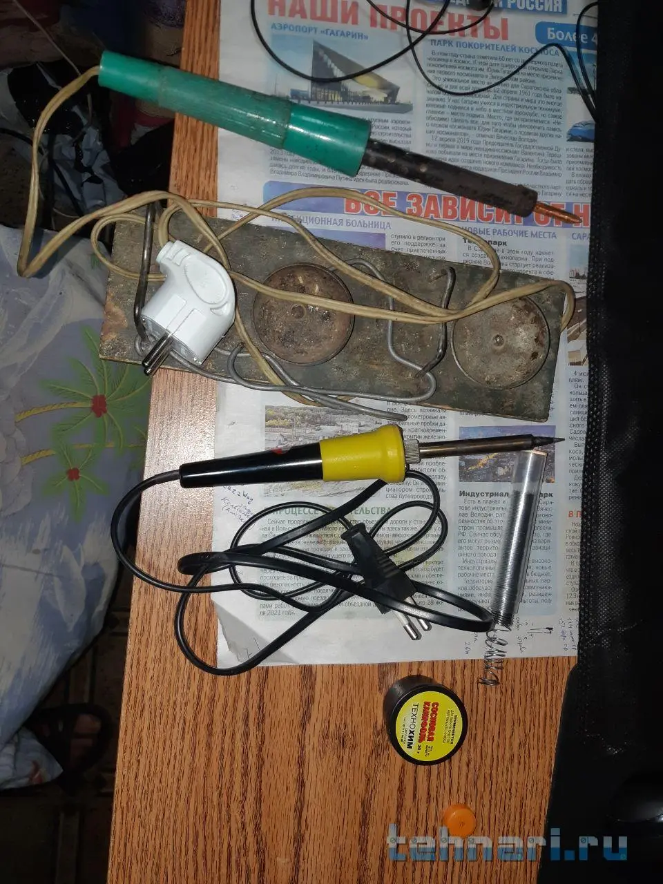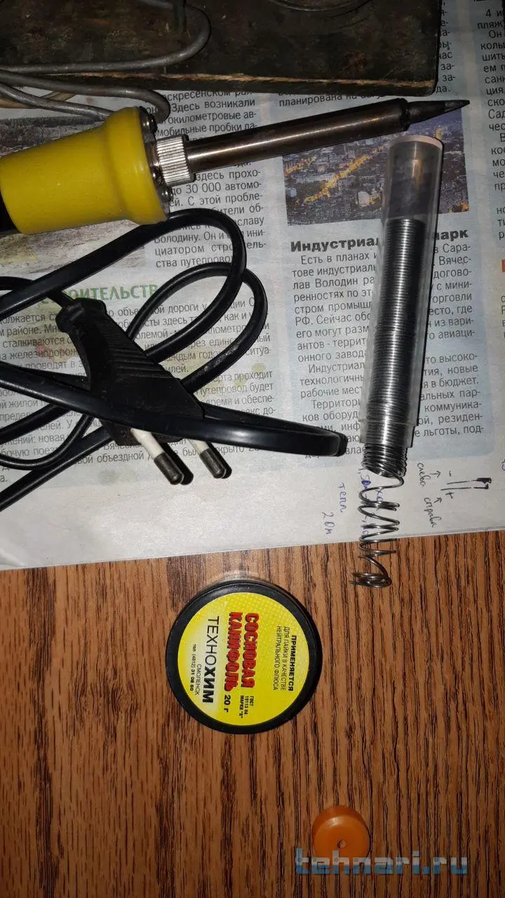 Нужно найти ещё конечно кусочек медной проволоки с миллиметр толщины, чтобы использовать в будущем, наматывать на Жало пояльника, для более точечной пайки, но думаю тут воспользуюсь паяльничком который справа "Жёлтенький" цветом. Мощность жёлтого паяльника 40ватт. Флюс - обозначения никакого нет на цилиндрической прозрачной мензурке, просто Олово =)