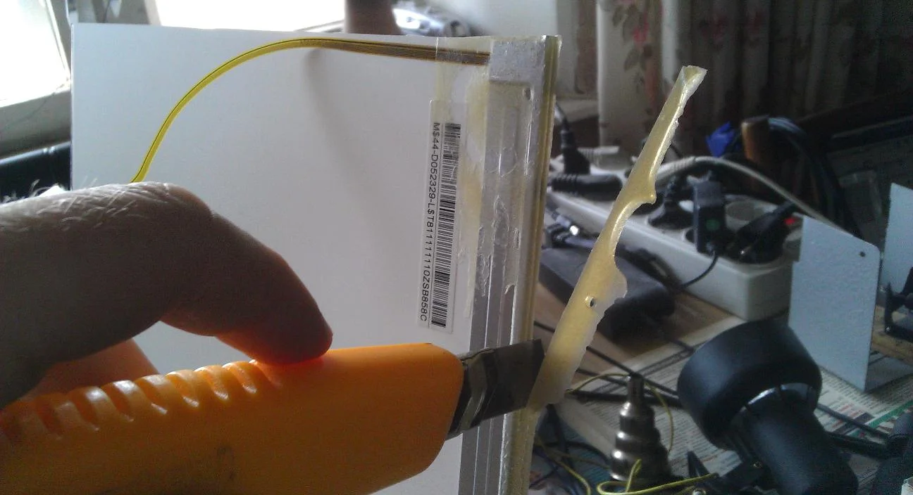 После затвердевания, удаляем малярный скотч и срезаем канцелярским ножем излишки клея.