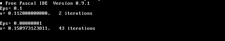 Writeln('x= ',x:0:12,',   ',N,' iterations');