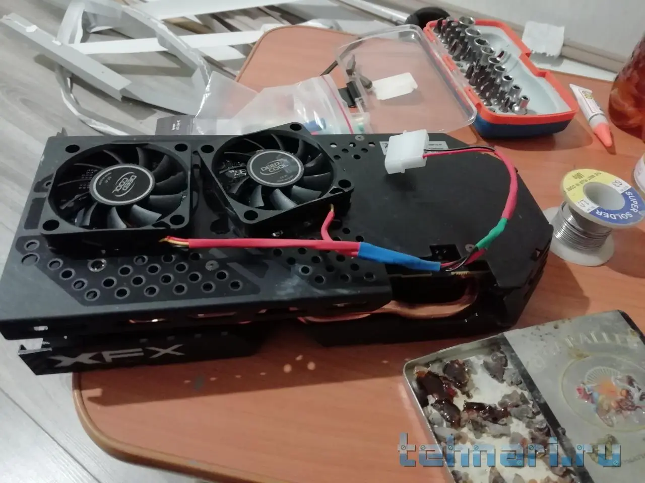 Тут не надо быть шибко умным, что бы обойтись без фото и знать, как работает регулировка вентиляторов в современных вк!!!А то, что на видеокарте используются вентиляторы с pwm, а ты хочешь цеплять к ним вентиляторы без pwm.