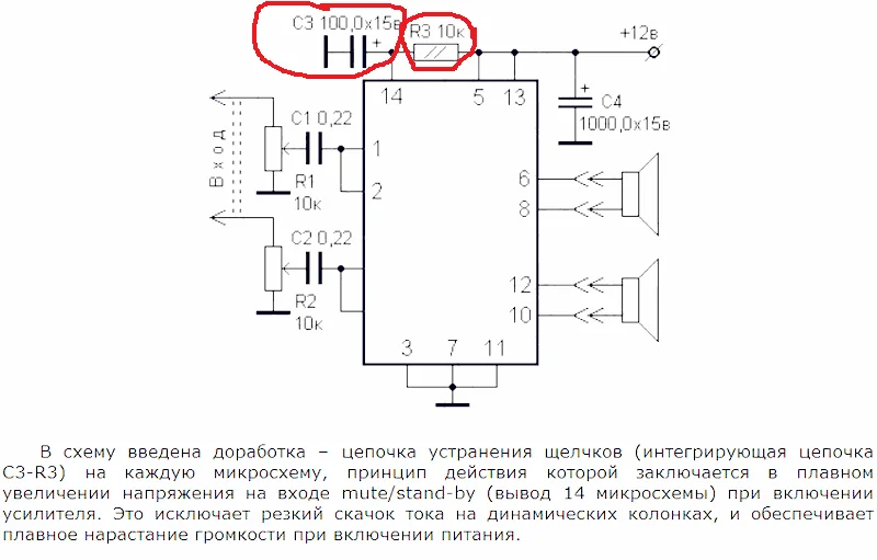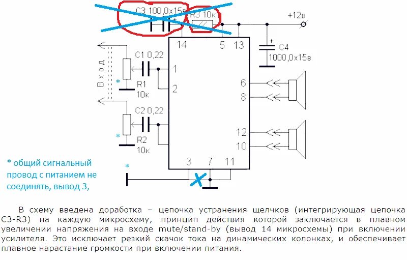 о чем вы говорите начинающие электронщики?)) вы хотя бы посмотрите даташит на микросхему, там каждый ее вывод подписан, и если уж там есть замечание что 3 вывод сигнальная земля, то ее не стоит соединять с питающей землей. это разные вещи. при включении усилка скачек напряжения проходит по сигнальной земле и вы слышите стук в динамиках, когда же земля сигнала изолирована от земли питания такого не происходит. и полная глупость что если 3й вывод отсоеденить от 7 и 11, то схема работать не будет.