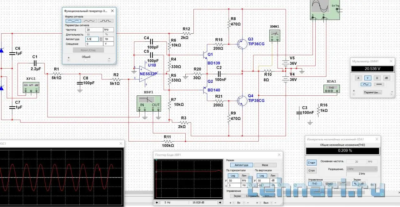 Какой вариант интересует, инверсный, как в журнале Радио, или неинверсный? Этих модификаций уже столько развелось...Дмитрий, не мог бы просимулировать авторскую схему с TL 071 КТ814 815Г, TIP 35 36 , сопротивление в цепи ООС вместо 200к 100к. +-36 в:tehnari_ru_281: