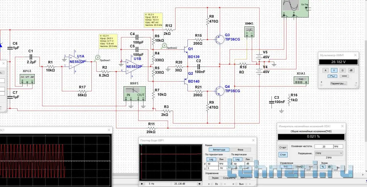 Спасибо. Не очень то в модели искажения уменьшились, хотя характер звука изменился значительно. Не знаю - лучше, или хуже. Надо время. Первое впечатление- очень положительное. Затем - как будто верха более проработанные, детальность,каждую щеточку- тарелочку слышно, но как- то утомлять начинает.Очень уж сладкий звук.Как у систем с применением D класса. Недавно несколько систем слушал на выставке, включая и Эдикоподобные. Араслановский помягче как то, не так все детально.Но поестественнее. Наверное, спектр у Дорофеевского не очень.По уму - измерять в железе нужно.Инвертирующий 1:1 как в Радио, R15=R21=0 и R8,9 отсутствуют дает ошибку симуляции.