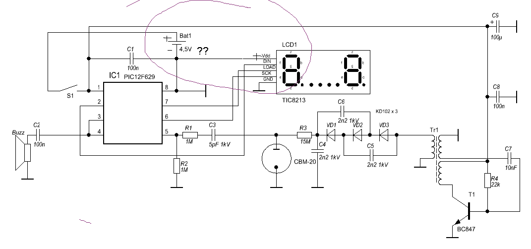 и еще, посмотрите пожалуйста на на эту схему дозиметра.Не наварочено ли еще, что нибудь в схеме ,кроме питания.