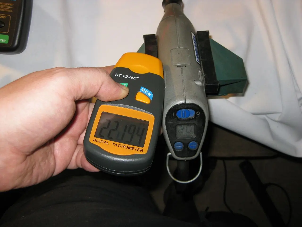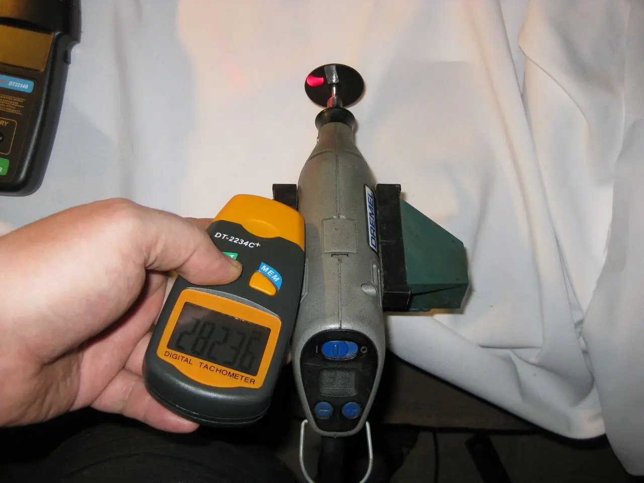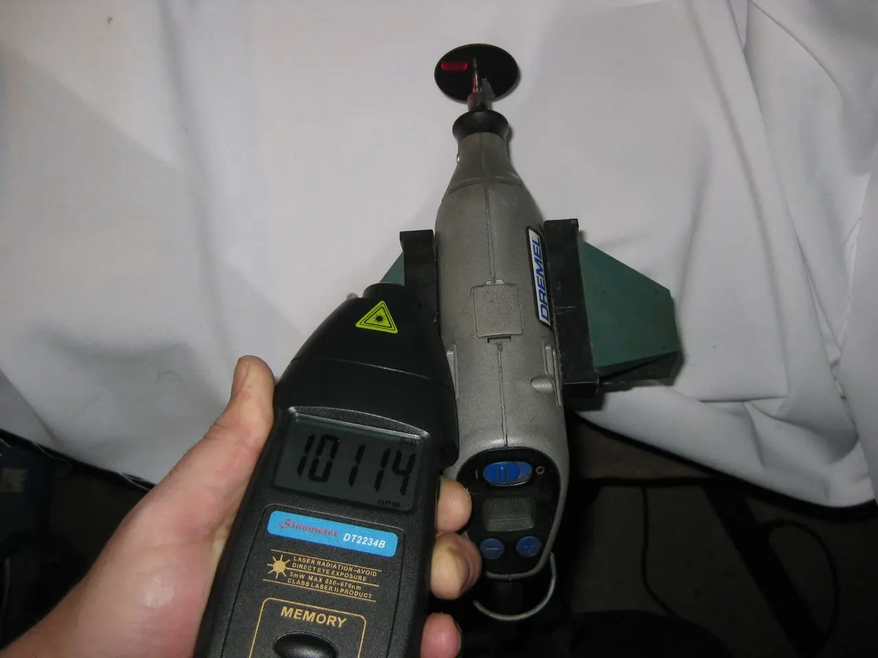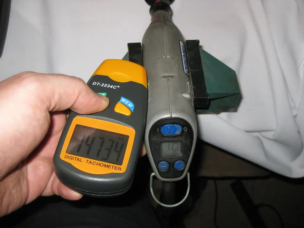 Добавлю лишь то, что проверка почти нового Дремеля 400 у моего приятеля показала около 9500 об/мин при значении "5" на дисплее одним из тахометров. В точности измерений сомневаться не вижу смысла, поскольку на асинхронном двигателе (2850 об/мин паспортных) рисует значение "2860", т.е. в пределах точности измерений.