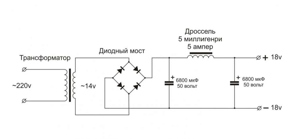 Для полной выходной мощности надо чтобы трансформатор имел на вторичной обмотке напряжение 15 вольт переменного тока и силой 4-5 ампер.