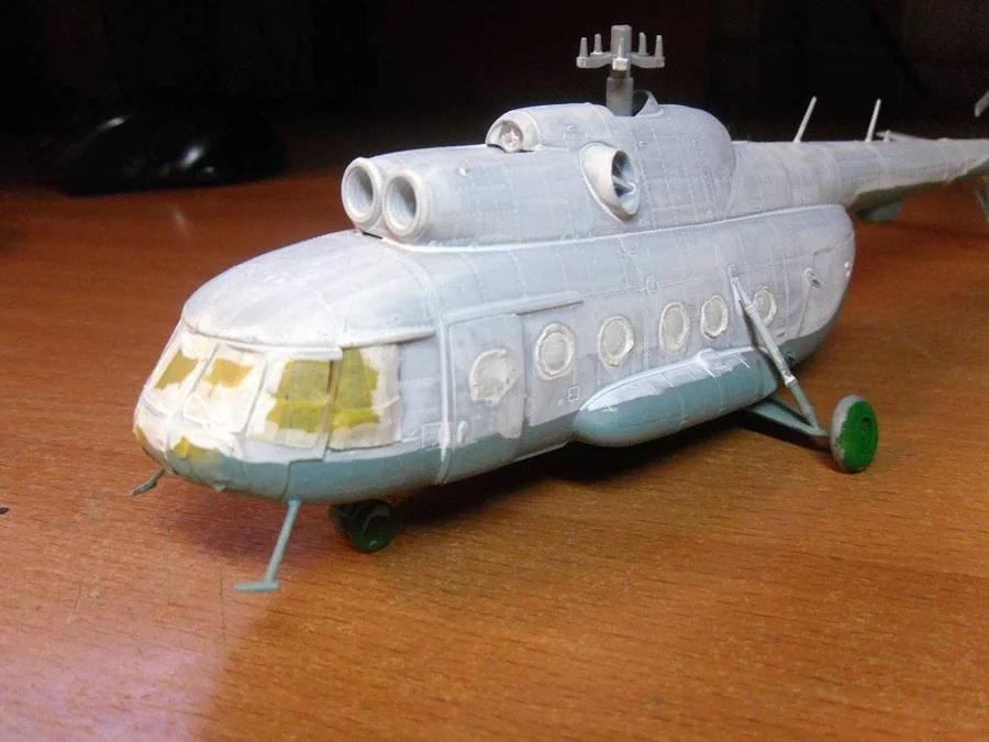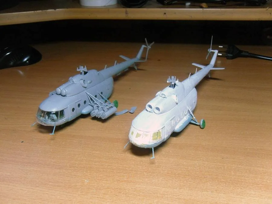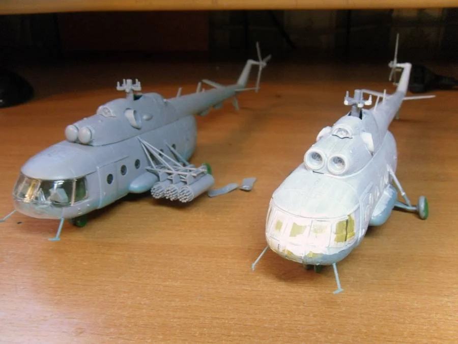 Всем огромный привет, все знают, что я люблю самолеты, но вот винтокрылых машин в моей модельной жизни было не много, это Ми-8 от фирмы Звезда в масштабе 1\72, но на днях меня попросили покрасить и по возможности привести в нормальный вид два вертолета марки Ми-8, все от той же Звезды, один будет в окраске Аэрофлота другой будет военный вариант - афганская машина. Модели уже собраны, качество сборки нормальное, но есть пара косяков, будем их исправлять, времени не много, но будем стараться собрать достойные экземпляры. В таком виде вертушки попали ко мне в руки...