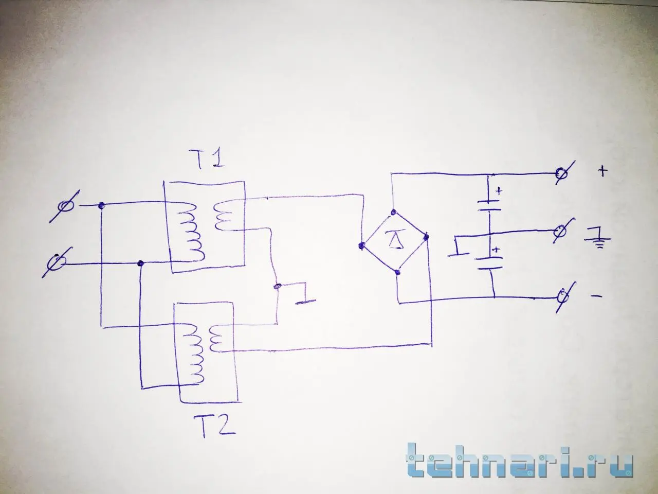 Я, во всяком случае, никаких препятствий к этому не усматриваю. Ваша схема отличается от стандартной только заменой вторичной обмотки трансформатора с выводом средней точки двумя трансформаторами. Да пожалуйста...Здравствуйте. Имеются два одинаковых трансформатора с одинарными вторичными обмотками. Могу ли я организовать из них двуполярный блок питания следующим образом?