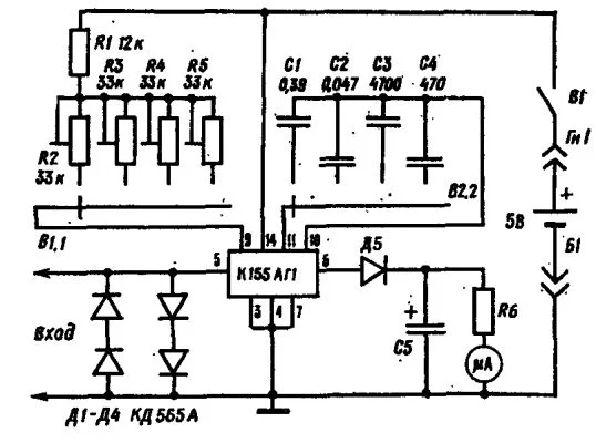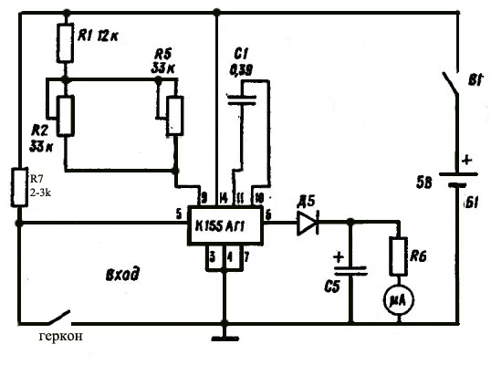 Такой нет, но есть схема аналогового частотомера, и схема компаратора найдется. Ниже приведена схема частотомера (книга "300 практических советов" Бастанов В. Г., страница 125), из которой в нашем случае нужно выбросить все лишнее, оставив лишь необходимое. Необходимыми будут микросхема одновибратора К155АГ1 (или ее аналог), резисторы R1, R2, R6, конденсаторы С1 и С5 и диод Д5. Переключатель тоже выбрасывается и нижний вывод резистора R5 подключается непосредственно к выводу 9 микросхемы. Сигнал на вход можно подать с цепочки из последовательно включенного геркона и резистора сопротивлением 2-3 кОм. Резистор подключается одним выводом к "+" источника питания, другим выводом к выводу 5 микросхемы К155АГ1. Геркон включается между тем же 5_м выводом и "-" источника питания.