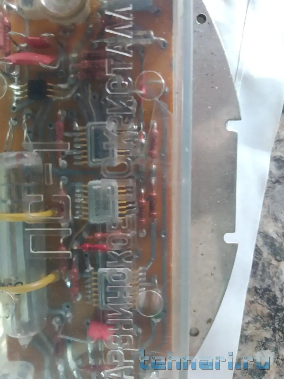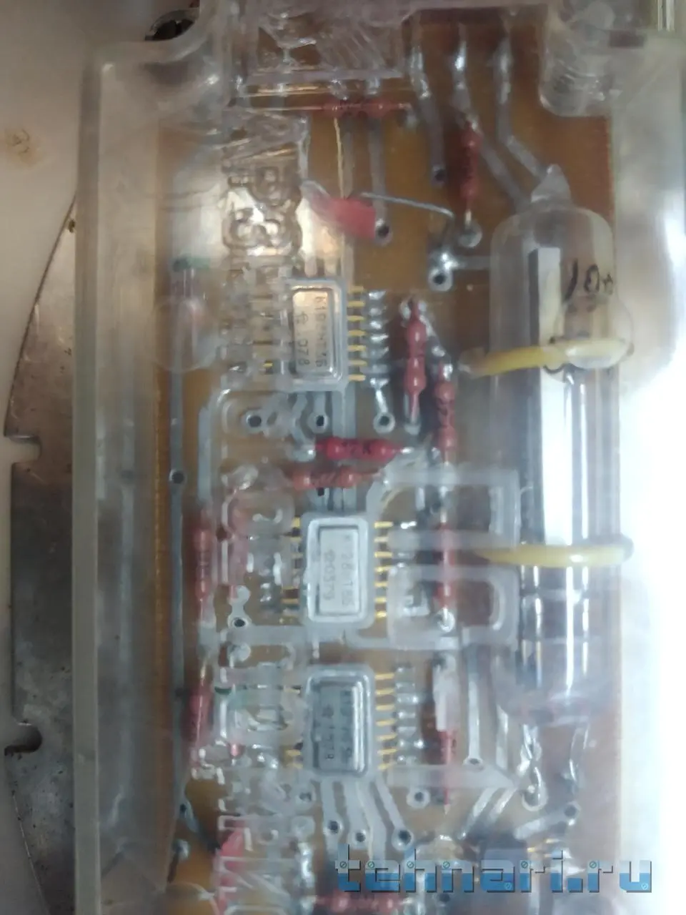 На плате установлены три сборки, состоящие из четырёх транзисторов. Две из них структуры n-p-n, одна p-n-p. Очевидно, это извращение армянских конструкторов, которым не досталось традиционных делителей частоты на триггерах. Печатная плата хоть и является заводского производства (присутствует металлизация в отверстиях), но складывается впечатление, что дорожки рисовали вручную или шелкографией.