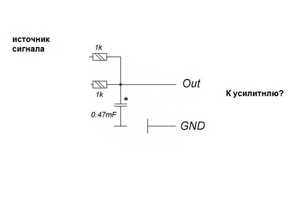 Если точнее, то эти три детали сходятся к выводу "Out"два килоомника и конденсатор со звёздочкой