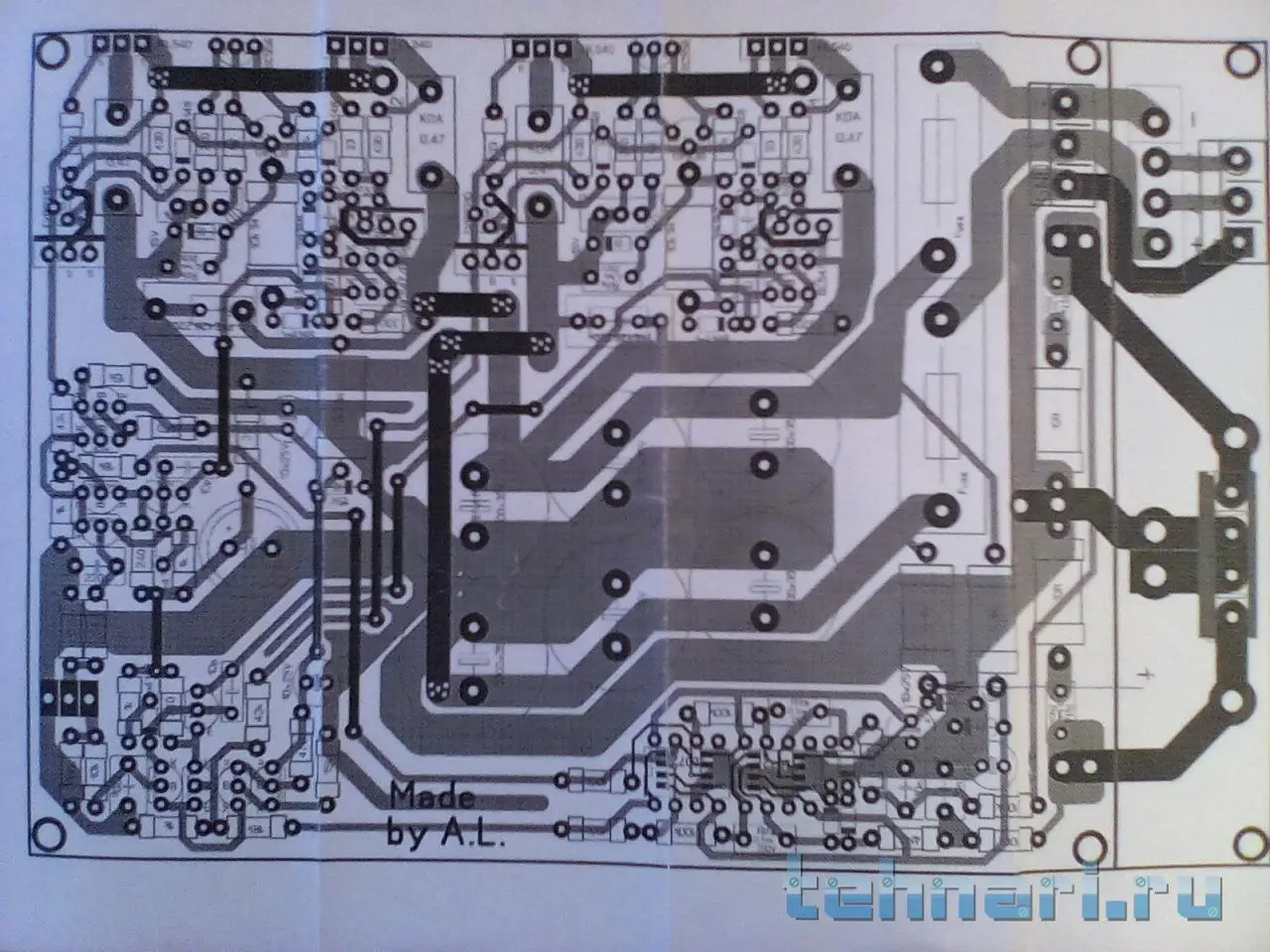 Плату получил готовую, какой то старый кит, печатка корявая, немного улучшал, резал земляные дорожки и т.п., ибо был фон... так же добавил на отдельной плате конденсаторов в БП. Схема и печатка ниже.