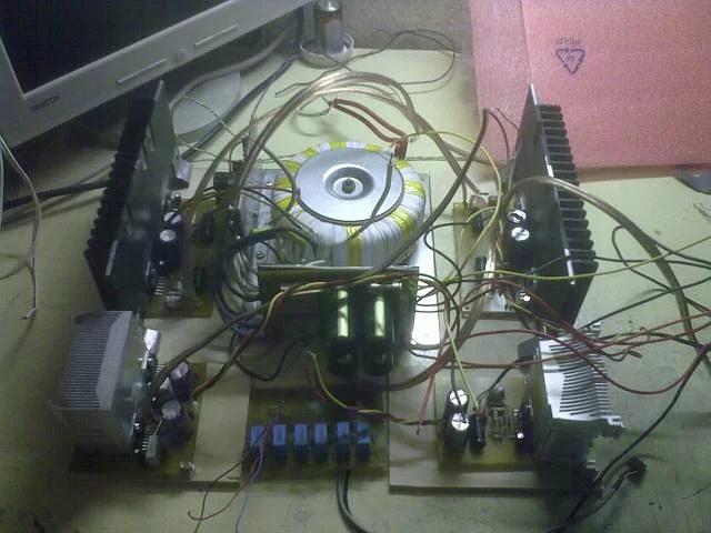 внутри 2*тда2050 при питании +-22в,принудительное охлаждение,трансформатор от маяк233 перемотаный.