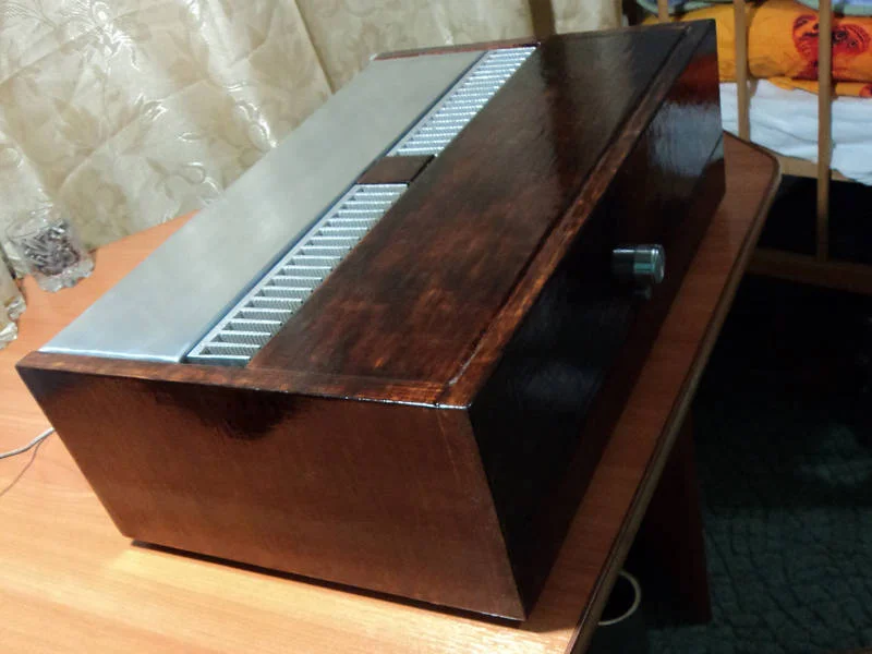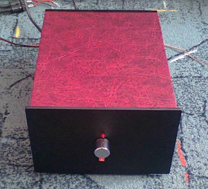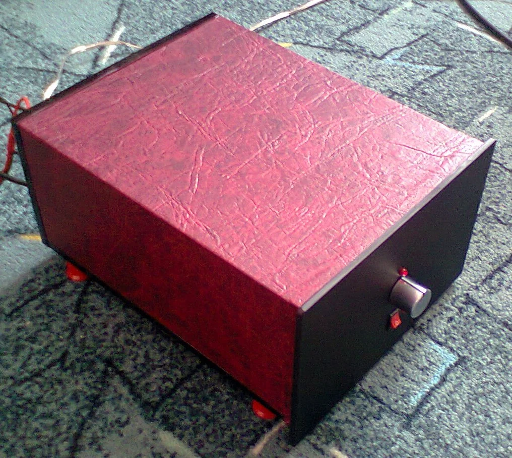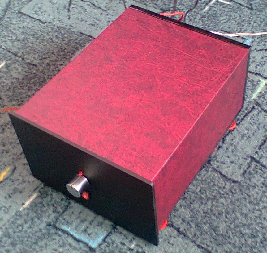 корпус из ДСП+ДВП+дермонтин(цвет-красный мрамор),передняя панель оргстекло 5мм,ошкурено и окрашено в 3слоя с балона автокраской.