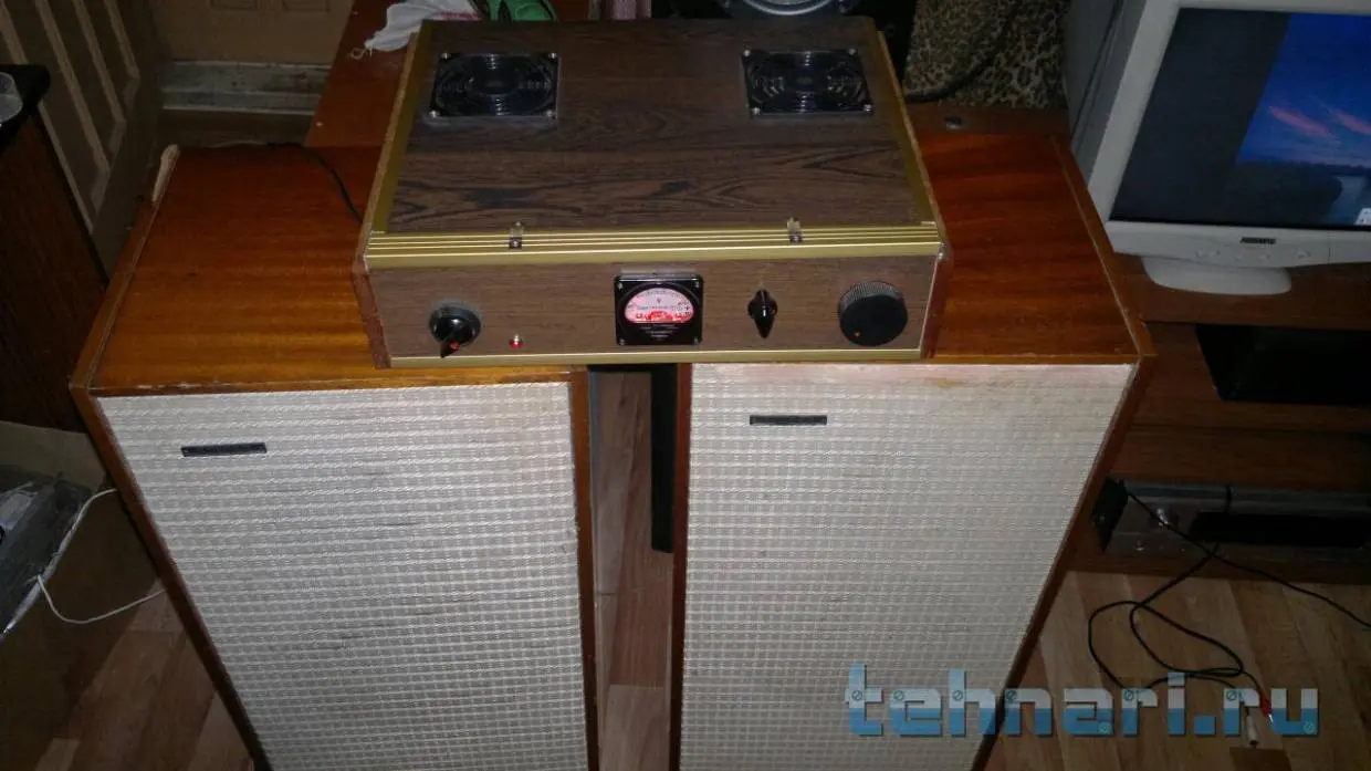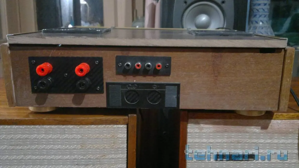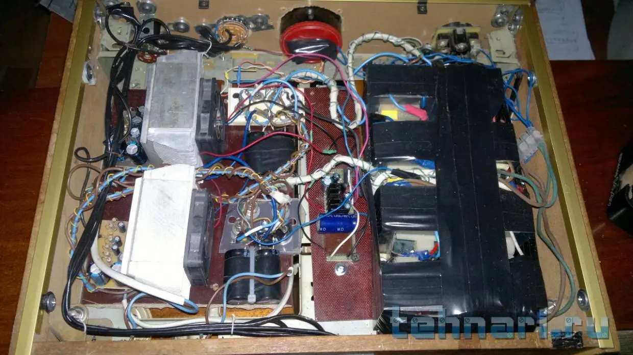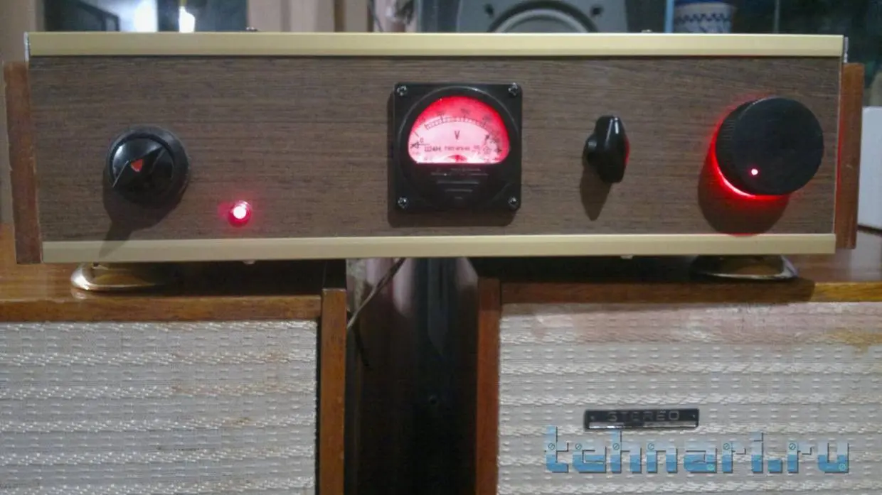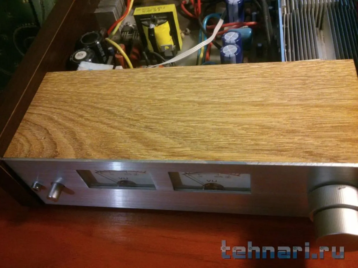 Доброго времени суток уважаемые ваятели! Насмотревшись на Ваше творчество, решил спустя 4 года /или лет пять/ доделать свое "произведение". Задача была - освободить полку в кладовке, задействовать железо пылившееся в коробке все эти годы и, наконец, вручить другу подарок к Новому году. А также успокоить свои дизайнерские....терзания ))). Аппарат предполагается использовать в гараже с АС 90 Радиотехникой. Начинка - ТДА7294, транс(ы) 2А +-29В на канал, селектор 2-х каналов - галетник на 3 поз., среднее положение как "Mute", вариант есессно бюджетный, поэтому РГ - обычный переменник. Проект первый и настолько надоело его строгать..:jazik: что до ума не доводил, надписи там.., щели и фонит самую малость - в гараже не критично! Внутренности, конечно, не сильно грамотно собраны, критика приветствуется, но в меру, т. к. проект первый, пробный и сильно не старался!