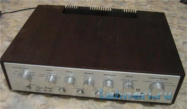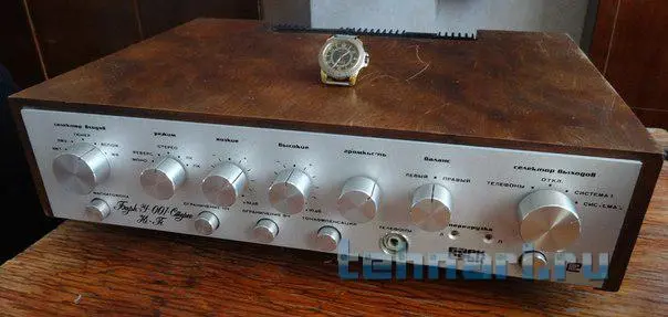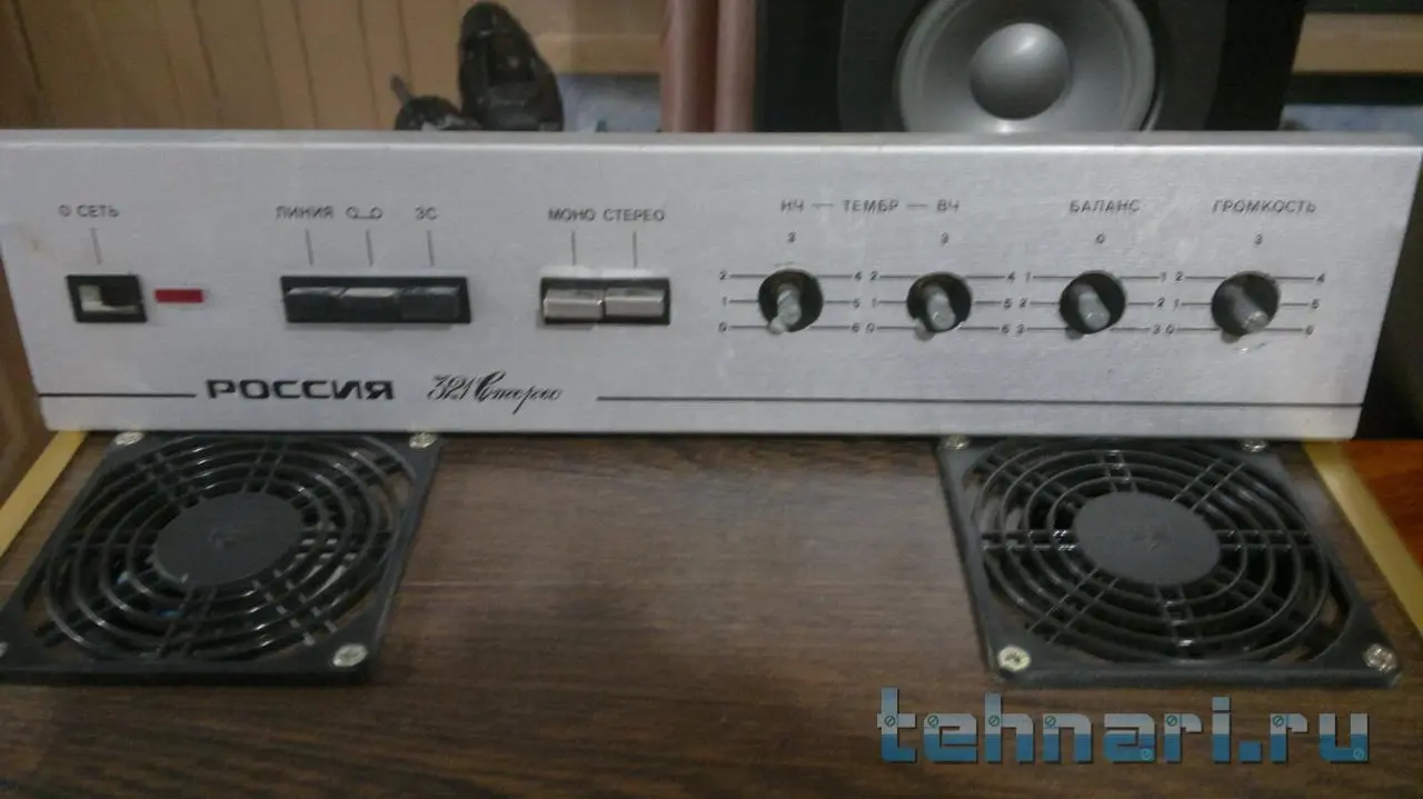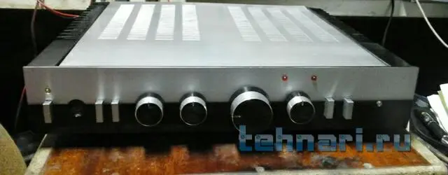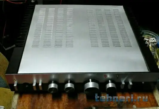 Собрал для хорошего чела полный умзч с коос на базе амфитона 202. Принёс две платы умзч на 7293 по стандартной схеме и убитый амфитон с просьбой сваять усь ватт 2×50max с хорошим качеством для прослушки от пкд/двд. От амфитона я оставил лишь транс и доработанный в ходе работы пред, остальное удалено. Установлено: колодка с 4мя клемниками выхода ас, две платы ум с коос на 7293, два моста с фильтрами-банки ничиком общей ёмкостью по 14700мкф в плечо, шунты, земля звездой в одну точку, переделаны две кнопки: режим MUTE/PLAY и режим IN POWERAMP/IN PREPOWERAMP поэтому сделаны два новых входа на тюльпанах а остальные закрыты аллюминиевыми заглушками, сделанными из верхней части корпуса электролитов к50-16 подходящего диаметра. Гнездо наушников закрывается такой же аллюминиевой съёмной заглушкой( на фото заглушка снята) Режимы ТК и ОТКЛ ТЕМБР задействованы по умолчанию. В отерстие от переключателя входов вставлен двухцветный светодиод и показывает режим mute/play. Индикаторы перегрузки загораются при 25w-менять настройку на 50w не стал по просьбе друга-он слушает не громко и ему так удобнее определять мощность. Корпус разбирался до винтика, шкурился до металла и рехтовались согнутые перегородки (пострадали либо от падения либо от рук вандала) Красилось краскопультом автоэмаль, ручки-полировка+покраска. Дизайн типа "даблколор минималистик" (были у меня в юности швейцарские часы-корпус чёрный хром, белый циферблат без цифр)вот меня ностальгия и натолкнула. Чел доволен, сюда фотки из мастерской.