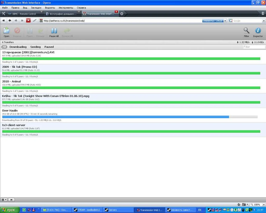 торрент управляется удаленно и запущен там автоматически. он складывает все на диск в свою папочку которую можно найти на сетевом диске. от туда и смотреть, не за чем что-то куда-то качать. на скрине еще видна панель-управления xbmc через веб интерфейс управлят тем самым ноутбуком который живет в кладовке и показывает кино на тв. кстати тв тоже подключается в домашнюю сеть, на сервере установлен медиатомб, и телевизор может своими силами показывать авишки. но мне это не очень нравиться