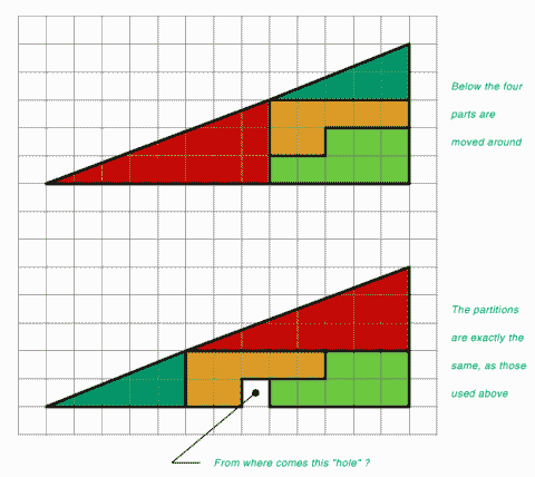 поэтому на верхнем рисунке "гипотенуза" сложенной фигуры не является прямой линией, т.е. фигура не является прямоугольным треугольником, как, собственно, и на нижнем рисунке.