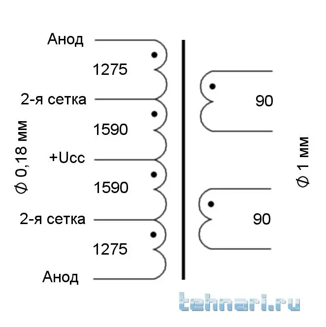 Будешь мотать первичку, не забудь пищевую пленку между слоями, в один слой (в которую колбасу заворачивают). Между обмотками малярный скотч (бумага) тоже в один слой. Вторичка на динамики разделена на два, параллельно - 4 Ома, последовательно - 8 Ом ... :)
