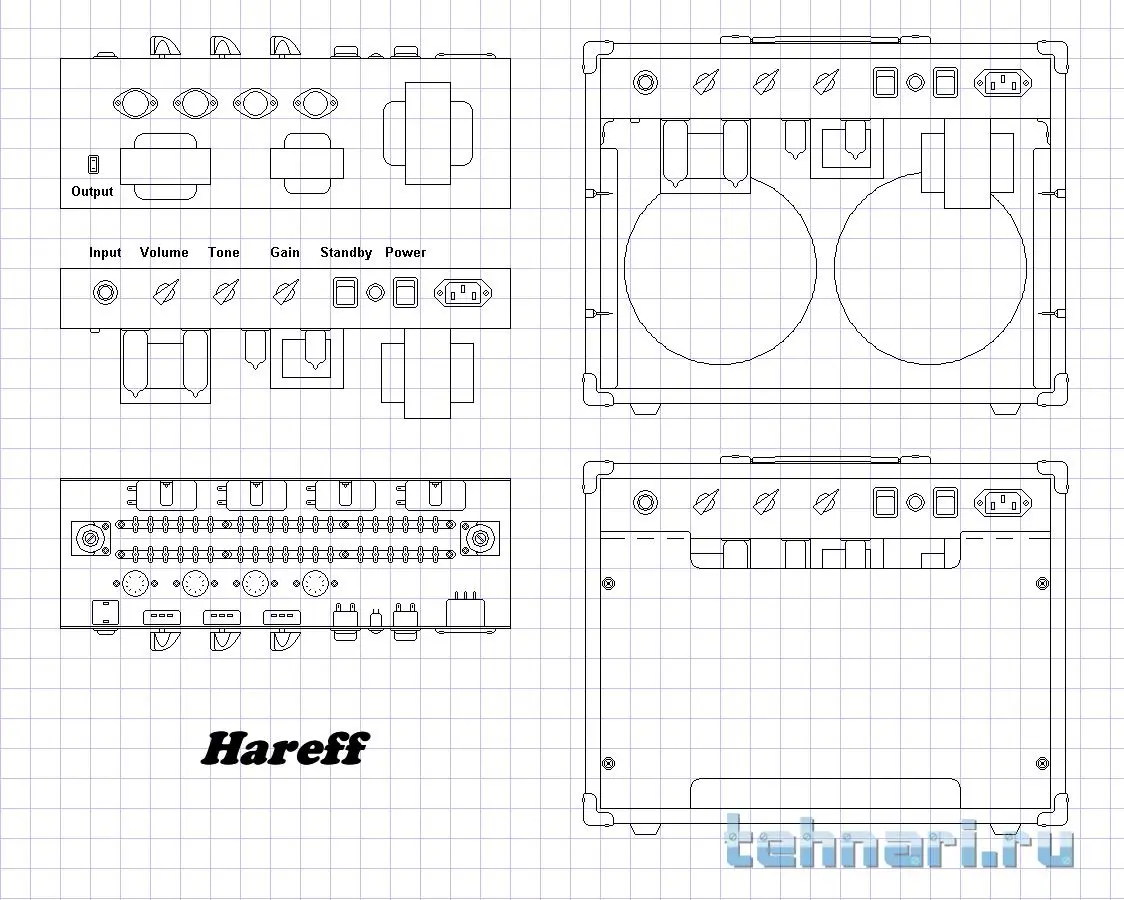 Сделали общий масштабный эскиз проекта, клетка 30 мм. Может кто подскажет или намекнет другое решение расстановки сил, но пока карта такая. Усилитель легко вынимается, достаточно открутить заднюю крышку, он не прикручен, лежит между верхней крышкой и уголками. На эскизе все легко узнаваемо ... :)